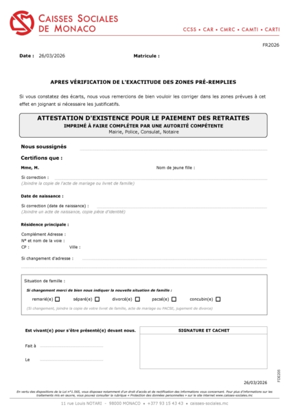 The form “Proof of Legal Existence for Payment of Retirement Pensions,” which appears on the back of the letter you have just been sent by our service, ABSOLUTELY must be completed, dated and signed by a competent authority (Town Hall, Police, Consulate, Notary, Guardian)